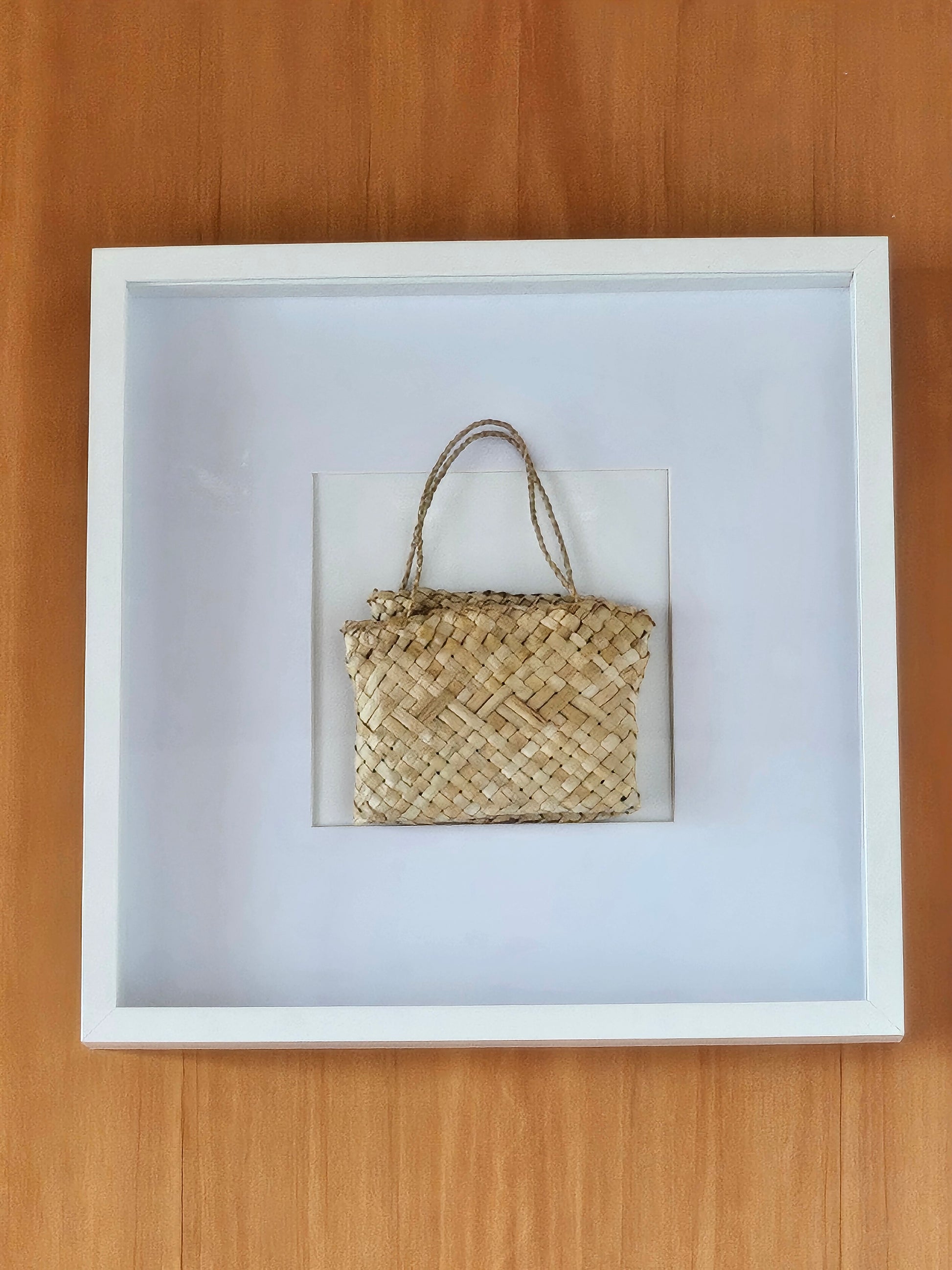 These small kete have been created using harakeke (flax) harvested from Omaka in Blenheim. The harakeke has been boiled to preserve it and the whakairo pattern used is whakanihoniho.