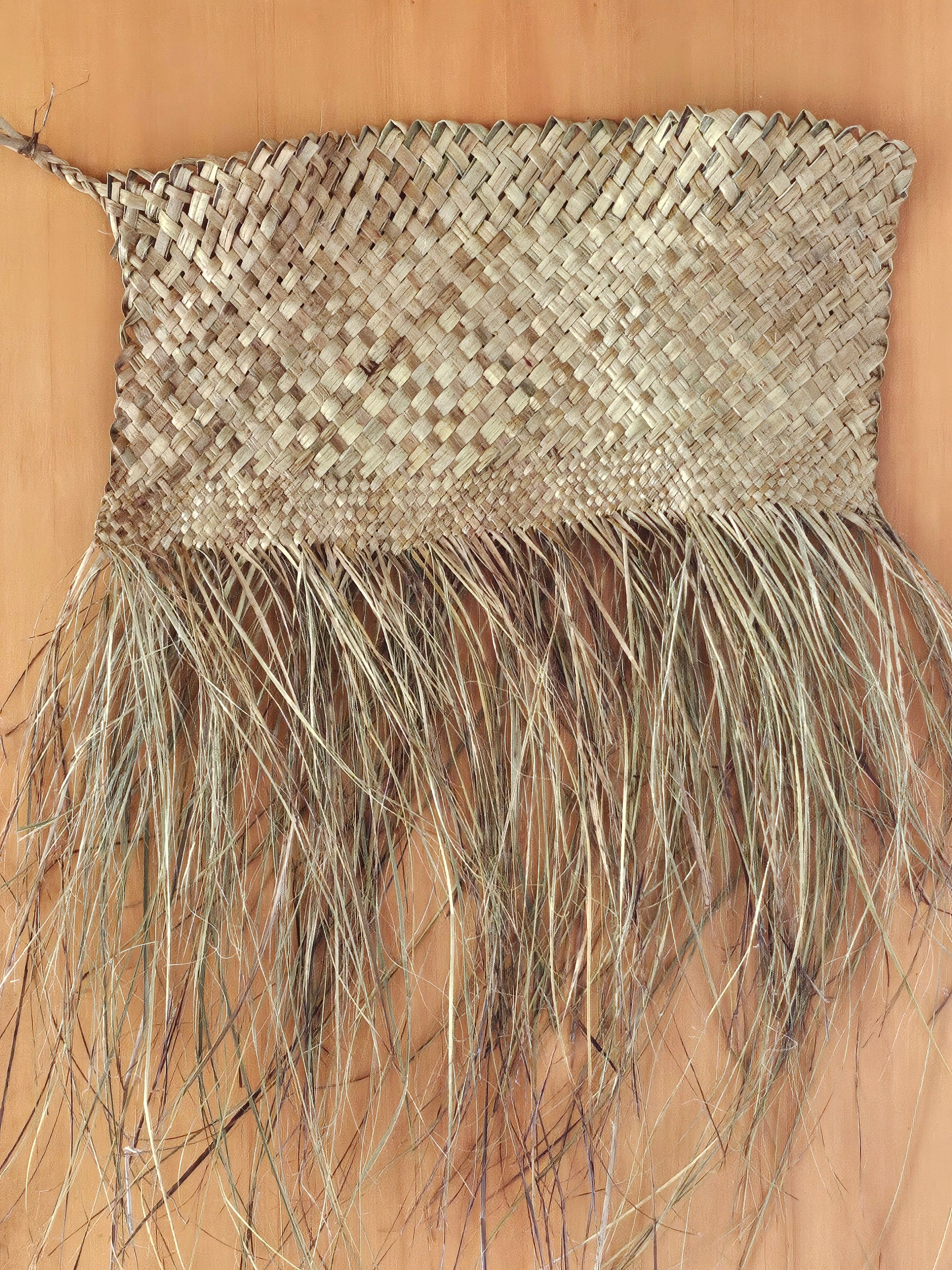 This piece is created using harakeke (flax) harvested from Koutu on the shores of Lake Rotorua. It is created from fresh, but old whenu. The particularly rustic look is exemplified in its name; He Aho Manawaroa, which speaks of the strong enduring threads shaped by time and nature. It also has a natural wave through it, which reflects the movement of the water that sits before it.