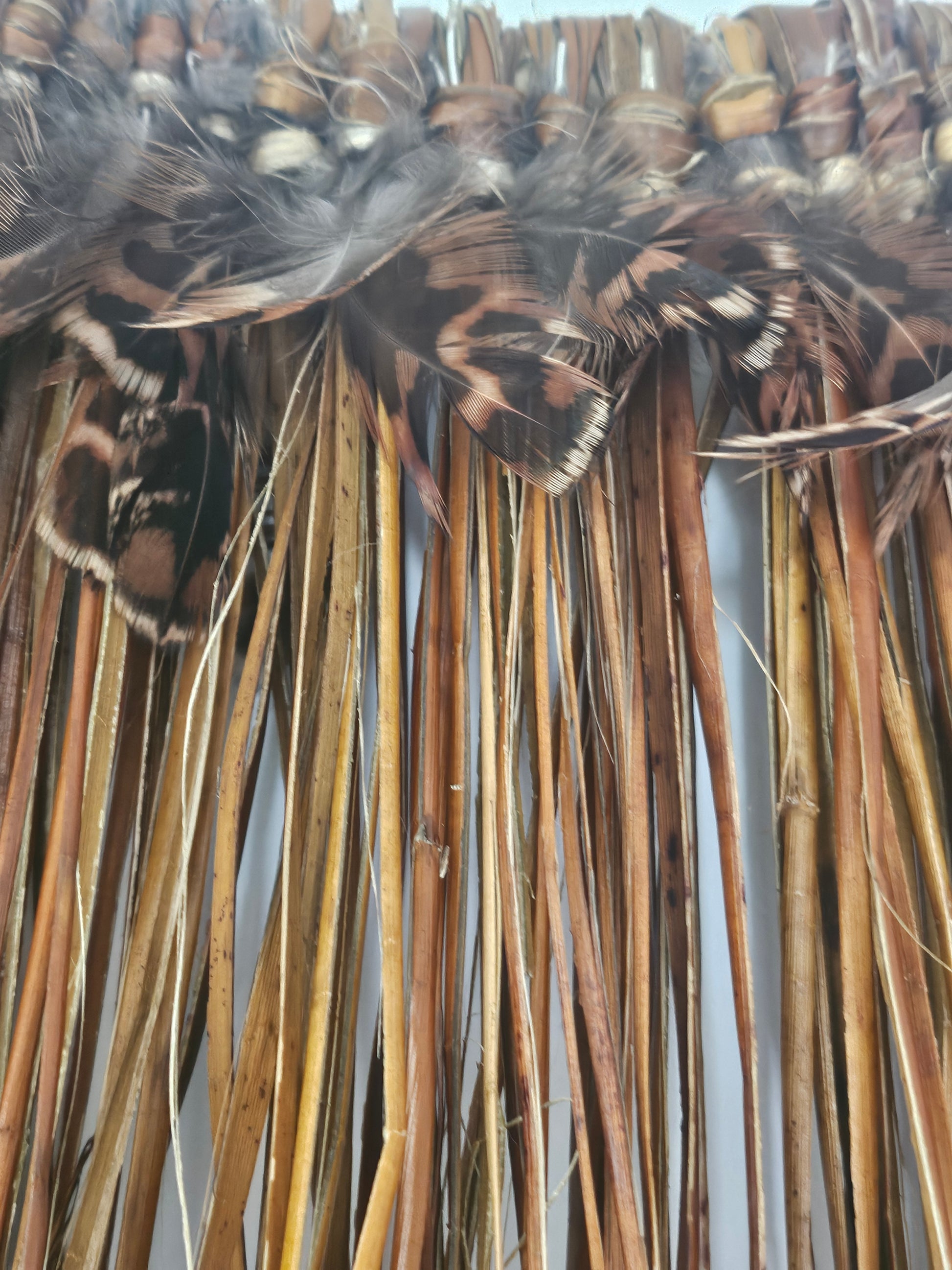 This piece is created using harakeke (flax) harvested from Maketu in the Bay of Plenty. The harakeke has been boiled and dyed mid brown, then shredded for the effect. Te Taiao o Peihana is reflected through the peihana (pheasant) feathers which are placed along the top.